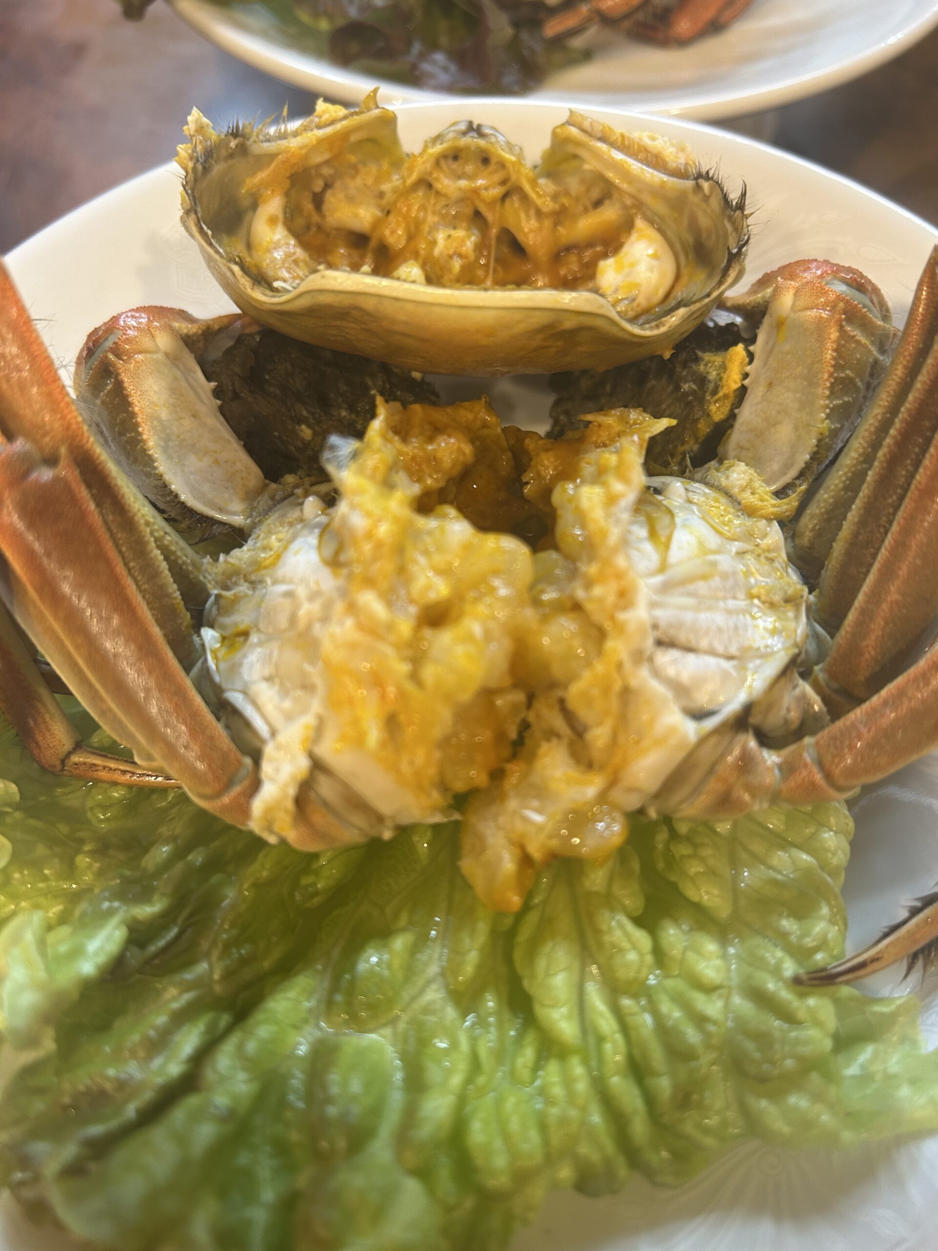 当店名物「上海蟹の紹興酒漬け」はもちろん食べたら癖になりますが、素材の良さを楽しめるシンプルな蒸し蟹もおすすめ!今年は、甲羅の口の裏にミソがたくさん詰まっている感じです。2026,1/18まで販売予定。年明けは、杯数が限られてきますので、元旦~1/18までにお召し上がりになりたい方は、先行予約がお勧めです。蒸した上海蟹(オス、メス)の食べ比べもこの時季だけ。特徴は、メス蟹は、オレンジ色の卵!オス蟹は、お腹のトロトロとしたうま味が濃縮されたミソ!上の写真はオス蟹。下の写真はメス蟹。トロトロ感わかりますか?