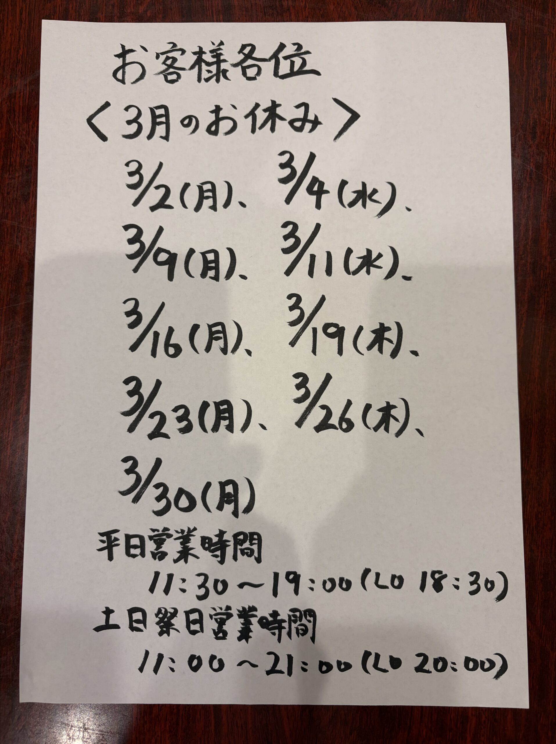 3月のお休み 2026.03.11 「3月のお休み」 3月のお休みは、お写真をご覧ください。 営業時間 平日 11:30~19:00(LO 18:30) 土日祭日 11:00~21:00(LO 20:00) 3月第3週目から定休日が月、木曜日に戻ります。 *ゴールデンウィーク(4/29~5/6)は、休まず営業。今年は、事前ご予約承ります。